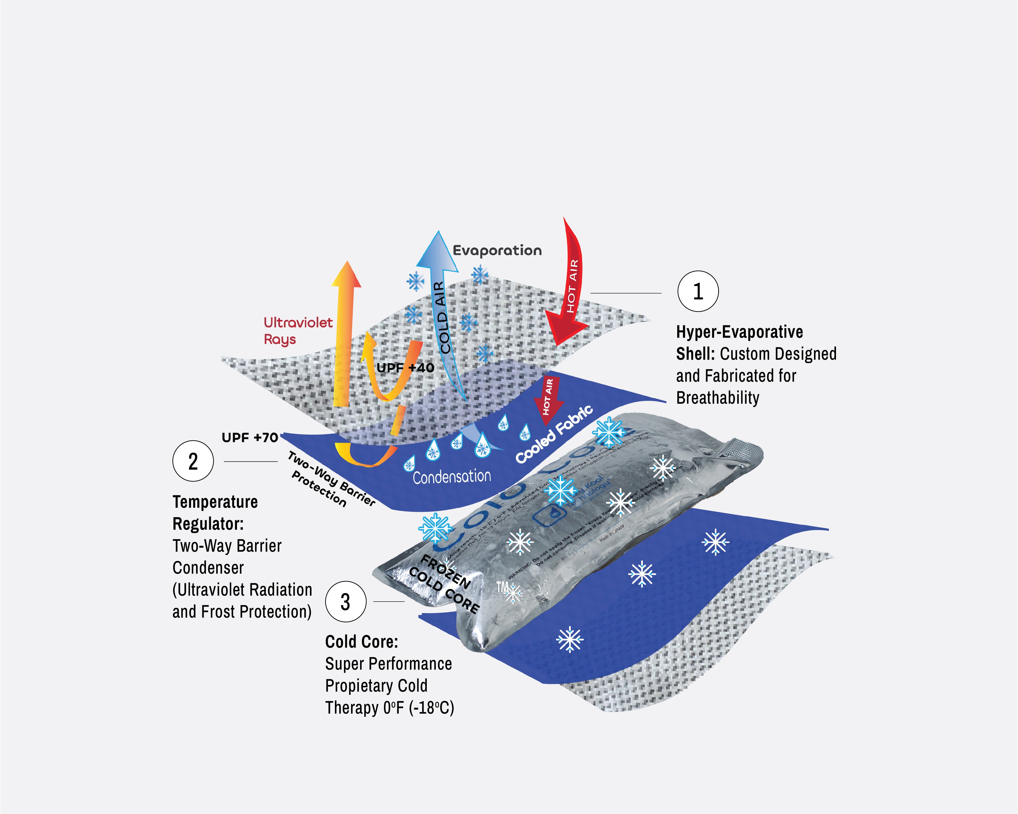 Patent-pending Body Cooling System, designed and engineered to perform above 90F (32C) to help boost your body's natural cooling system against extreme heat.